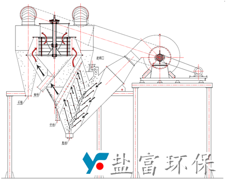 鹽富環(huán)保公司生產(chǎn)的YF-SF復(fù)合選粉機是將靜態(tài)的V型選粉機和內(nèi)循環(huán)高效渦流選粉機有機結(jié)合,可分級粒徑為4.75mm甚至最大粒徑達10mm以上的物料。來料首先通過靜態(tài)的V選進行粗細分離,中砂和細砂隨上升的氣流進入高效渦流選粉機進行分級,石粉則被旋風(fēng)筒收集。從老式的轉(zhuǎn)子選粉機只能對機制砂簡單脫粉到實現(xiàn)粗、中、細砂的精確分級。