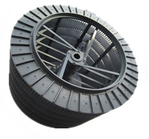 2、在籠形轉(zhuǎn)子與外部殼體之間的中間部位均勻布置了若干塊帶"凹"字形槽的導(dǎo)向葉片,含塵氣體須從導(dǎo)向葉片之間的約15mm左右的若干條縫隙沿切向進入由導(dǎo)向葉片與籠形轉(zhuǎn)子組成的環(huán)形分級空間,由于導(dǎo)向葉片的存在徹底消除邊壁效應(yīng),粗灰中細灰的含量大大降低,分級效率大幅度提高。